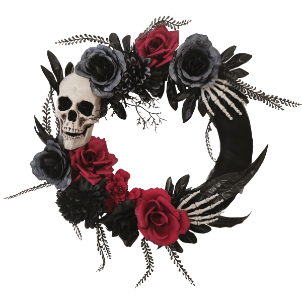 Spooky 18-Inch Halloween Wreath with Skull and Skeleton Hands with Roses is perfect for your home this season! The small plastic Skull detail is hand-painted with a realistic finish, while the Black and Red Roses and Carnations provide a decorative touch. Black Ferns and Twigs are woven in along with long thin Black Leaves to give interesting accents. Really pretty wreath with just a touch of the macabre! Includes a Black Ribbon for hanging, making it easy to display on your door or wall.