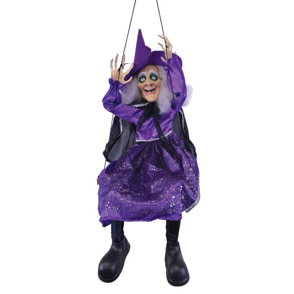 Add some giggles to your next haunted scene with our fun Kicking Witch on a Swing! Her Eyes Light Up when she speaks, and her Legs kick periodically. She has little black witch boots, a deep purple Satiny Dress with a silver glitter overlay and silver braid trim. She has a little Black Cape with matching silver braid that ties at the neck. Fluffy greyish-white hair covers her shoulders, and she has a black witch hat with more glitter on the hat band. She hangs by a black satiny cord that extends from the swing seat to her hands and creates the hanging loop. Requires 3 AA Batteries, not included.