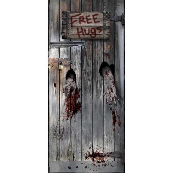 Make it look like your Haunt has a Dungeon Doorway with holes that allow the Monster behind it to reach out for a deathly Hug! A printed handmade "Free Hugs" sign appears to hang over the openings. You can use this on any door or wall for a great effect! 4-color realistic print on Polyester with Metal grommets for easy use. Measures 71 inches x 31 inches. Easy to use and simple to store for next year!