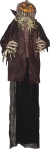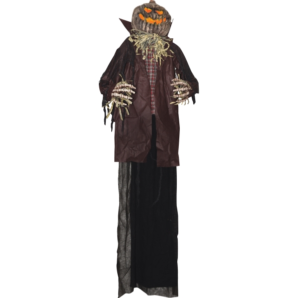 Introducing the 72-inch Pumpkin Man Light-Up Prop! This spooky Scarecrow is perfect for your Halloween display. His Lighted Pumpkin Head with flame-colored LEDs makes him extra eerie. He also makes Spooky Sounds, adding to the atmosphere of your holiday d_cor. Plus, his Posable Arms ending in Skeletal Hands allow you to creatively position him. He even comes with a string for hanging!”_