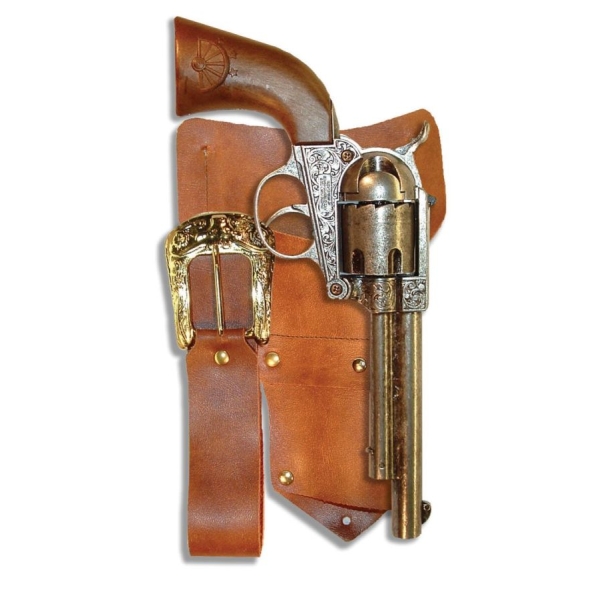 Realistic-sized metal toy revolver with vinyl leather-look holster and 1 inch web belt. Fits ages 5+. Holster is separate and could be used with any 1 inch belt. Uses 12 shot ring cap (BF-63), not included.