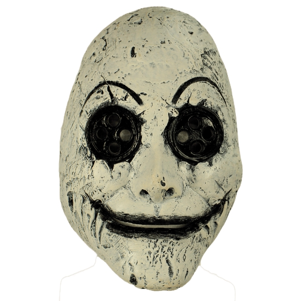 The creepy, macabre Button Eyes Latex Face Mask has an evil grin that is perfect for a horror movie, scary Halloween Costume, or a Haunted House. The pockmarked face appears to be wearing white cracked pitted makeup. The black button-look eyes look disturbing, but provide good visibility. Holes near the nose allow free breathing. A wide elastic strap holds the mask securely in place, Made of a base of black latex for greater depth and durability. One size fits most Adults and Teens.