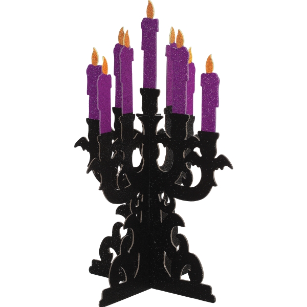 Candelabras are a spooky and elegant staple for any Halloween scene, now made effortless with this lightweight glitter paper and PVC plastic option! Ornately cut out shapes of swirls, bat wings, and thorns made of black glitter paper decorate the base, and purple melted look glitter paper candles hold aloft a paper glitter flame made of gold and orange glitter. Two piece design slots together easily to stand on it«__s own.