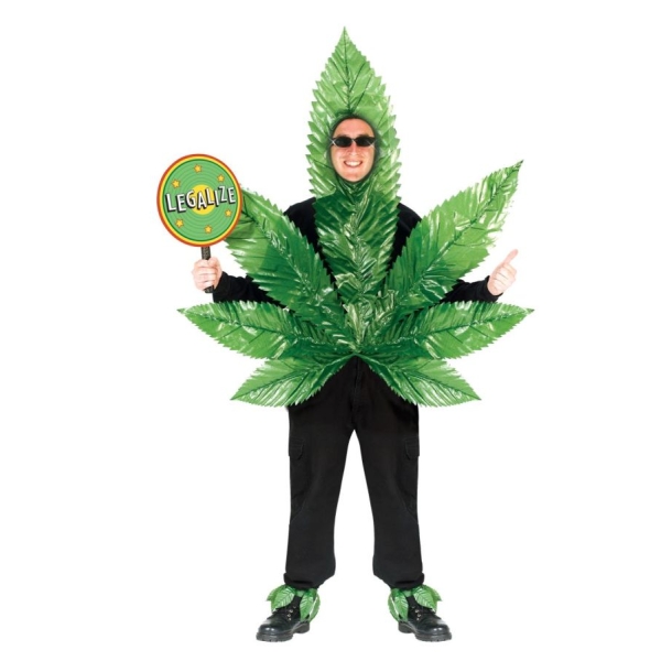 Plastic ganja leaf costume, matching ankle bands and "Legalize" sign. Simply supply your own black suit, leaves strap into place and you have one great costume. One size fits most adults.