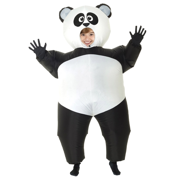 Giant Inflatable Panda Costume will get laughs wherever you go! Perfect for fun videos, parties, and special events! Fits Children ages 8-12. A large face opening allows for good vision, and the 100% polyester Jumpsuit is sturdy and Easy to Wipe Clean. Just step in, zip up, and activate the fan. Inflates in seconds! Elastic at the wrists and ankles prevent air leaks. Cool, lightweight, and very comfortable to wear! Package includes the Jumpsuit, inflating fan, and battery holder. Requires 4 AA Batteries, not included.