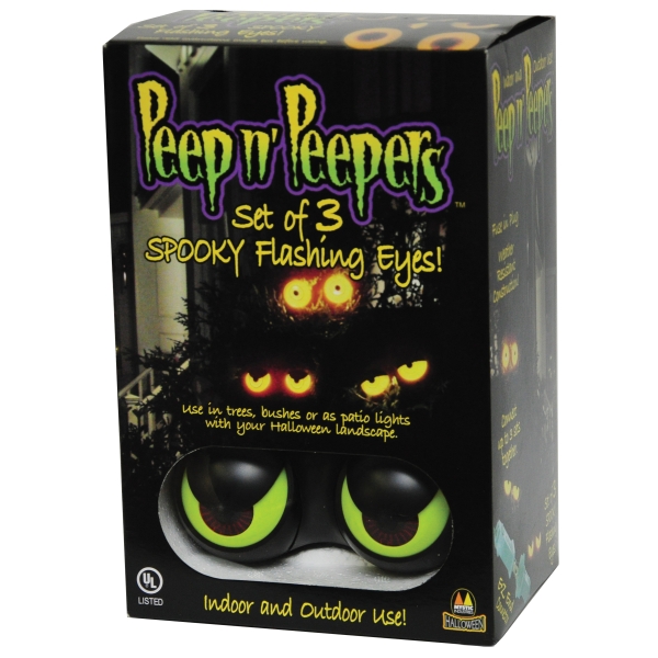 3 Sets Of Eyes Per Light String, Assorted Per String, White With Blue Eyes, Yellow With Red Eyes, And Purple With Yellow Eyes. Each Set Of Eyes Individually Flashes And Eye Lids Rotate. Has Prismatic Colored Iris. Each Pair Of Eyes Comes With Hook For Hanging In Bushes And Trees. Full Color Box And Ul Listed. Simply Plug Into A 110 Outlet. Total Length Of 6 Feet With 23 Inch Spacing Between Peepers. Connect Up To 3 Set. Comes With An Ez End Connector. Indoor-Outdoor Use.