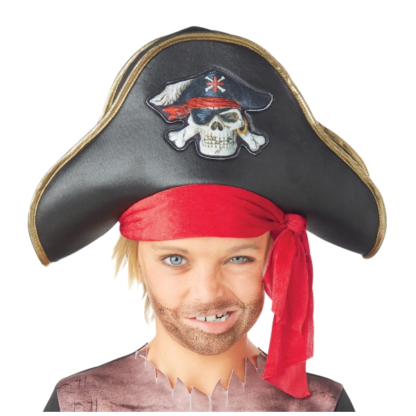 Arggh, Ye Mateys! Sail the Seven Seas with this Leather-Look Pirate Hat for children! Shiny Polyester Fabric is trimmed in golden braid with a large Skull & Crossbones Patch in front. An Attached Red Bandana adds a dash of color! Just the right finishing touch to your own pirate outfit for Halloween, school historic plays, or fun dress-up activities. One size fits most children.
