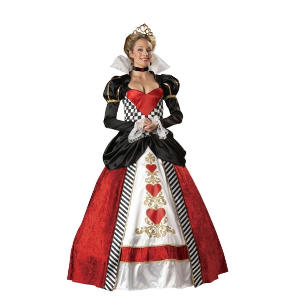 Full length gown with printed heart details and gold trim, hoop and tulle petticoat, velvet jeweled choker and sequin heart tiara. Small fits bust 33-34.5, waist 25-26.5, and hips 35.5-37. Runs small, order next size up. Adult size 4-6. Care instructions: Machine wash cold, gentle cycle. No bleach, hang dry, cool iron if necessary.