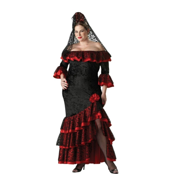 Panne gown with layered satin and lace ruffles, sequin headpiece with lace mantilla veil and fishnet pantyhose. XXL fits bust 44-47.5, waist 36-40, and hips 46.5-50. XXL fits 20-22.