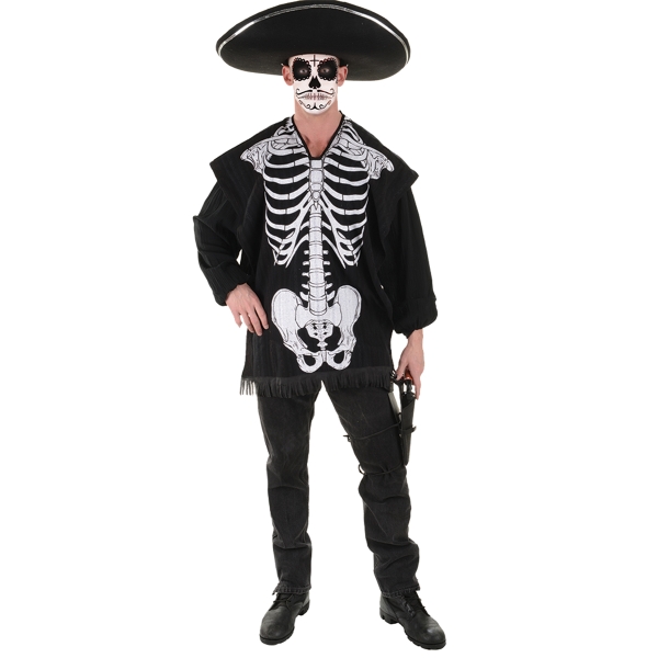 A Great Look For A Day Of The Dead Party Or A Goth Look! Serape Overlay Has Screen-Printed Skeletal Design. Serape Only. Add Your Own Pants, Shirt, And Hat! One Size Fits Most Adult Men.