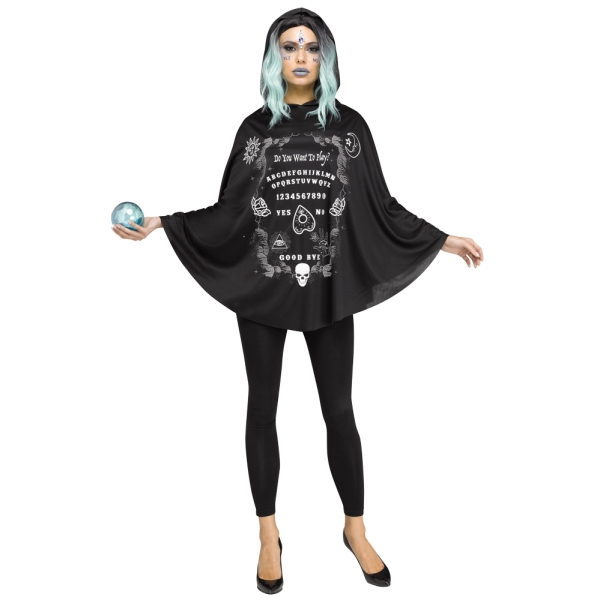 You'll be ready to summon the spirits when dressed in this creepy Spirit Board outfit. This adult Spirit Board Game poncho is a quick and easy way to add spooky style this Halloween. The Womenís Spirit Board Poncho by Funworld features a black hooded poncho with white game board print. Black leggings, ball and shoes are not included. One size fits most adults.