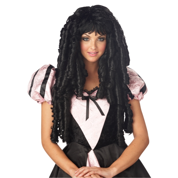 Deluxe black wig with long barrel roll curls. One size fits most adults.